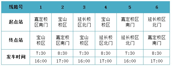 2.上车点在各校区的校内,其中宝山校区上车点为:行政楼站点、体育馆前站点、北门站点、西门站点、后勤大楼站点,嘉定校区上车点为嘉定校区南门内站点,延长校区上车点为延长校区北门内站点。下车点在各校区的校门外。