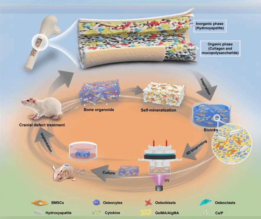 如今,这个项目的阶段性成果诞生了。科研团队采用数字光处理生物打印技术,打印出骨头的3D结构,实现了骨组织复杂结构的精确复制。生物墨水是生物3D打印的重要原材料,他们研制了一种新型生物墨水,由甲基丙烯酰化明胶、甲基丙烯酰化海藻酸钠、羟基磷灰石组成。这种生物墨水不仅能模仿天然骨基质的复杂性,还具有自我矿化和细胞分化能力。“骨头里有很多矿物质,是一种硬组织。”苏佳灿教授解释,“我们制备骨类器官的原料是软组织细胞,但经过体外培育,这些细胞不但会分化,还能自我矿化,成为类似骨头的硬组织。”
