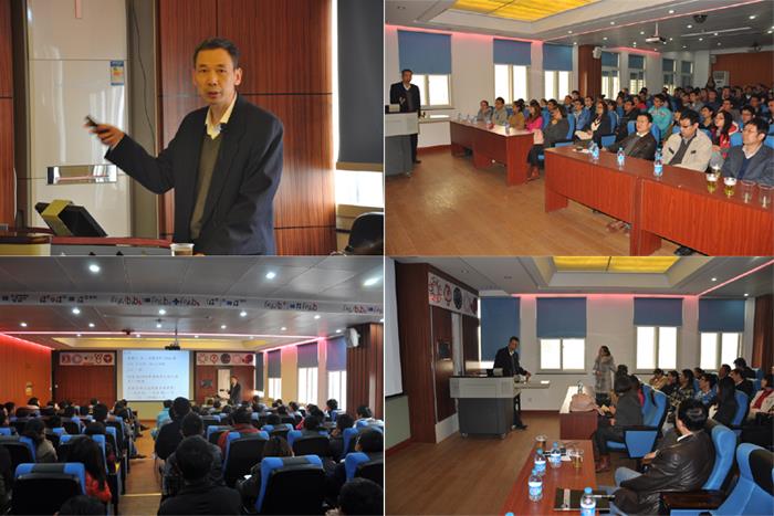 2013年12月6日,理学院“当代科学前沿讲坛”第187讲及数学学科系列报告迎来了中国科学院数学与系统研究院席南华院士,席院士作了一场题为“数学—简单与高深”的学术报告。报告厅G507内座无虚席,很多慕名而来的学生只能坐在过道上。席南华院士从实际生活中的简单例子出发,深入浅出地展现了数学的无限魅力,精彩幽默诙谐的报告为师生送上了一次“学术大餐”。 席南华院士的报告从最简单的数出发,从生活中的排队引出了映射、群的概念,从解方程引出了代数学中的Galois理论,从有限到无限,从可数到不可数,最后引出了数学中的三大理论:分析、代数、几何体系之间的关系,道出了数学的简单和高深之处。席院士在报告之中旁征博引的讲到Galois, Abel,Wiles等数学家的历史故事,博得台下师生的阵阵掌声。