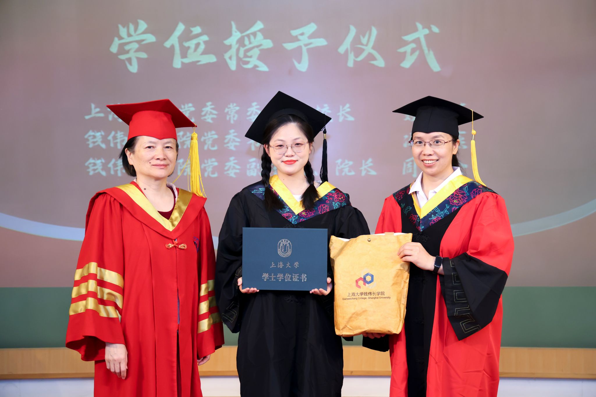 在最隆重的学位授予仪式环节上,周全院长逐一宣读了毕业生名单,聂清副校长为上台的毕业生们拨穗并授予学位证书,冯凌燕书记为毕业生们颁发了毕业纪念品——学院吉祥物“犇犇”等物品,希望伟长学子们带着一股拼劲儿,争做伟长牛人,不断奋进!